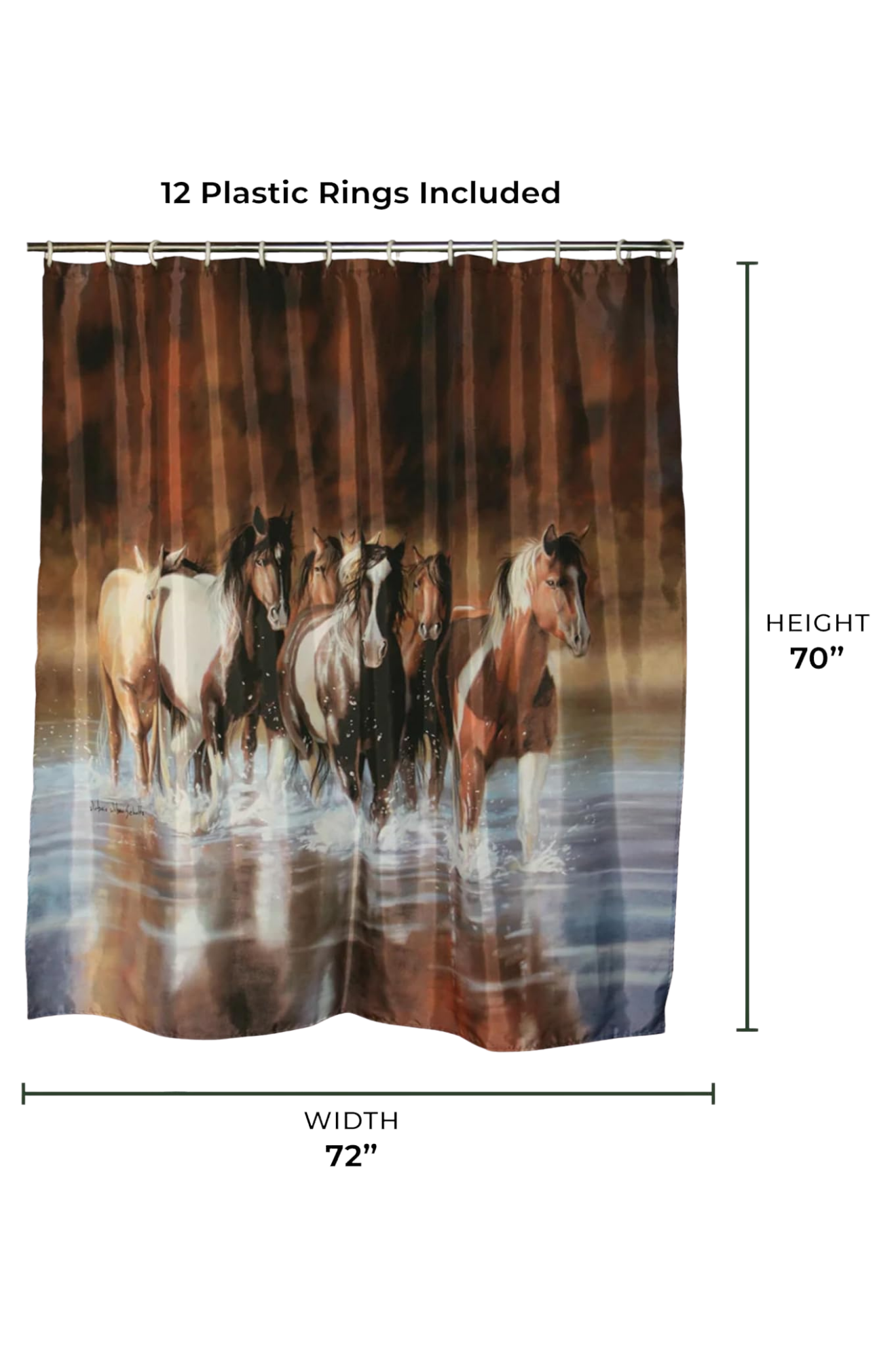 Bring the spirit of the wild into your space with this stunning horse-themed shower curtain. Featuring a breathtaking scene of majestic horses walking powerfully through shimmering water, this design captures strength, freedom, and natural beauty in rich, earthy tones. The warm sunset backdrop blends deep browns, golden ambers, and soft reflections, creating a dramatic and calming atmosphere.
