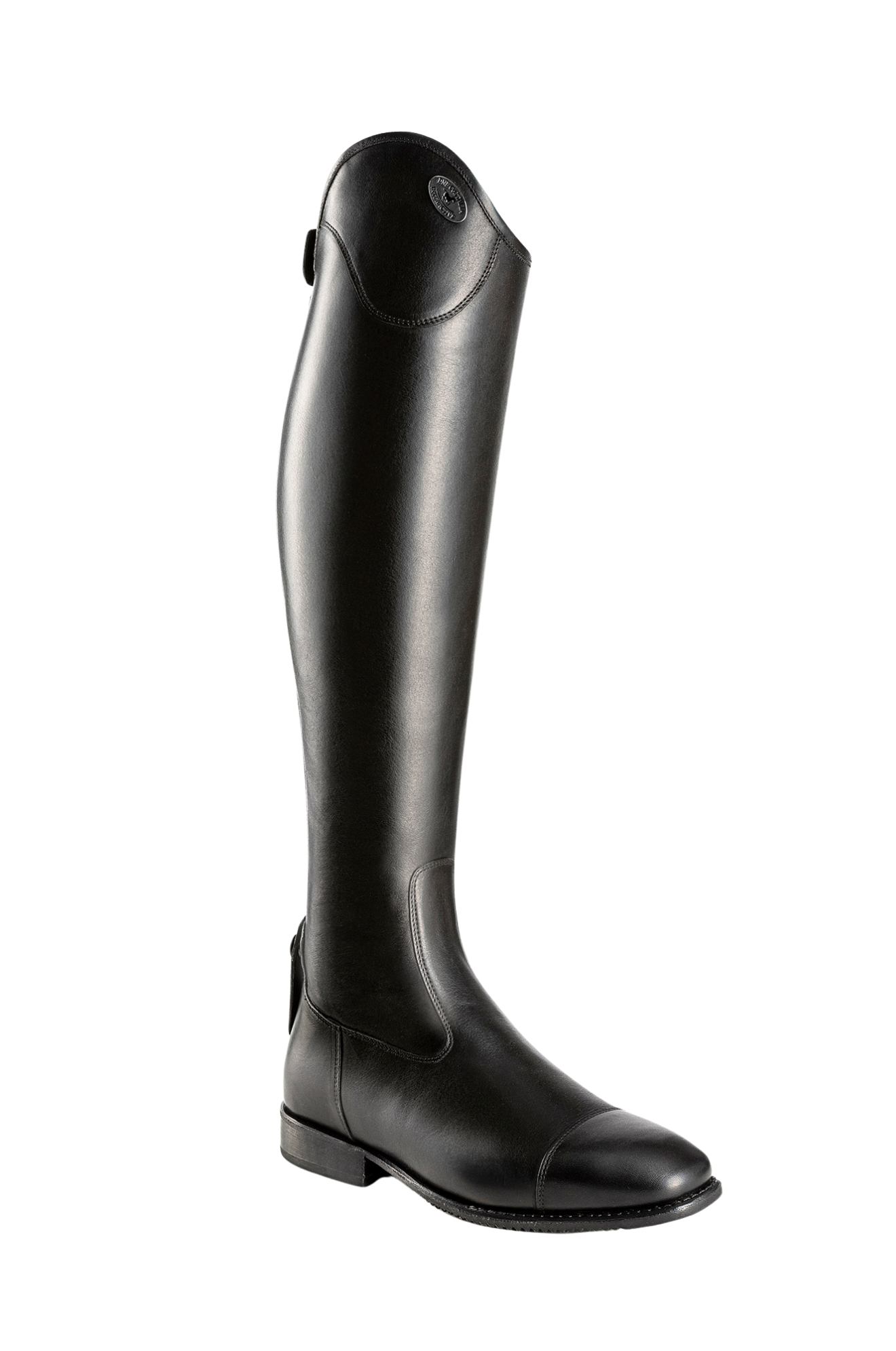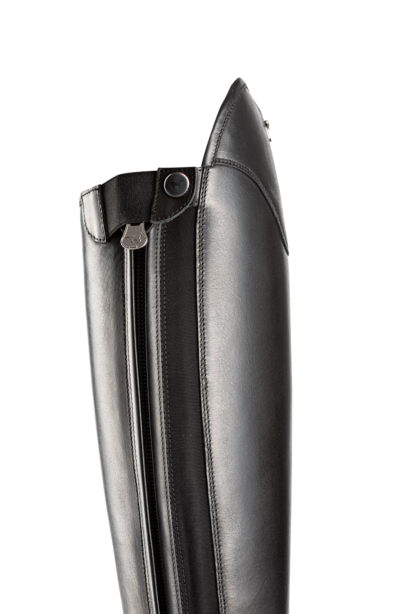 The DeNiro Salento Dress Boot is a completely handmade riding boot that features DeNiro's superb performance and quality. Elegant, handmade boots with Italian calfskin WRAT leather, which provides long-lasting color, durability, and water-resistance. Full length back zip contains flexible spine to maintain shape and is flanked by an elastic panel that provides a close, contoured fit. Inner sole with shock-absorbing activated carbon and durable Vibram outsole. Extra high Spanish top.