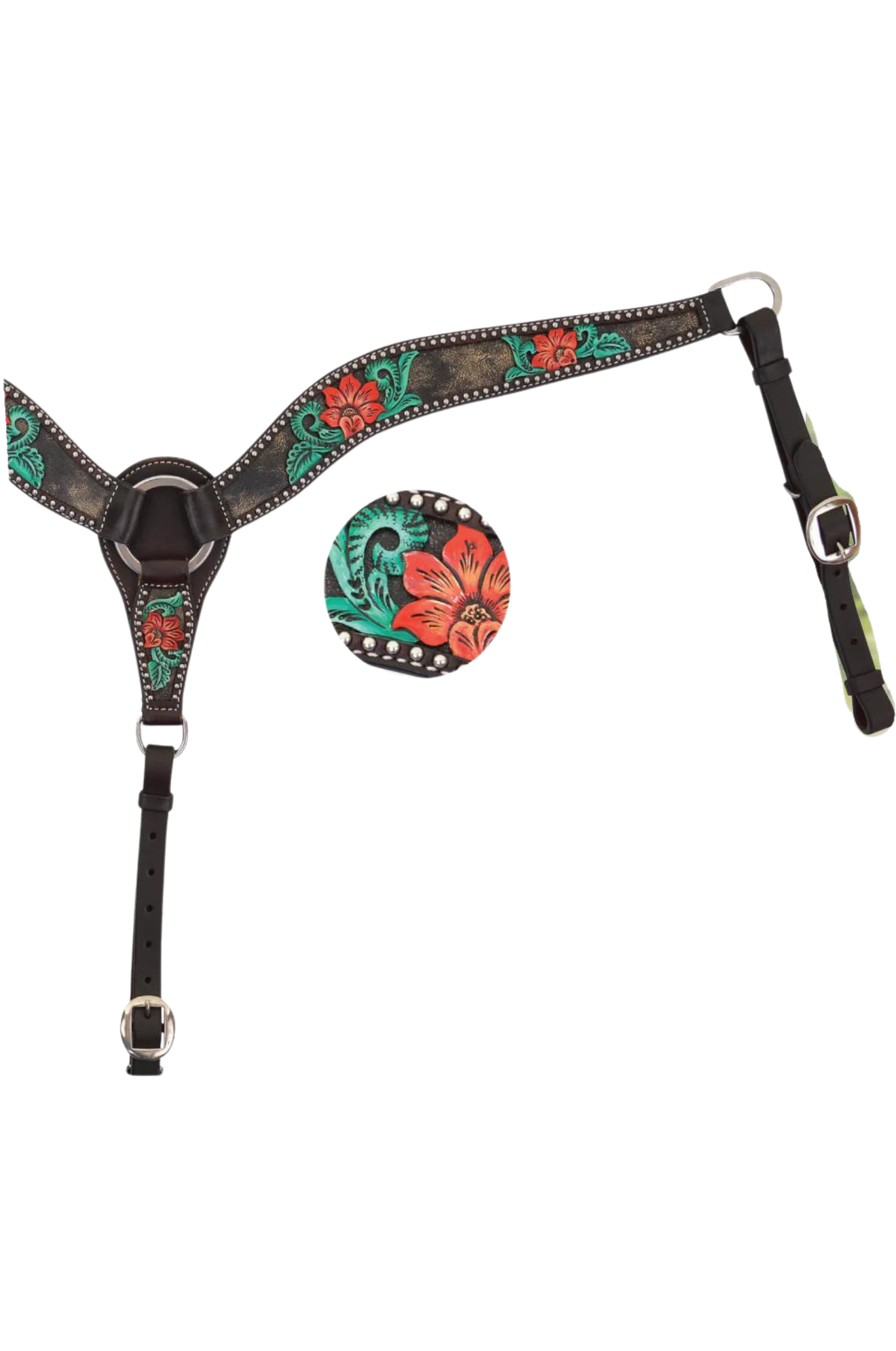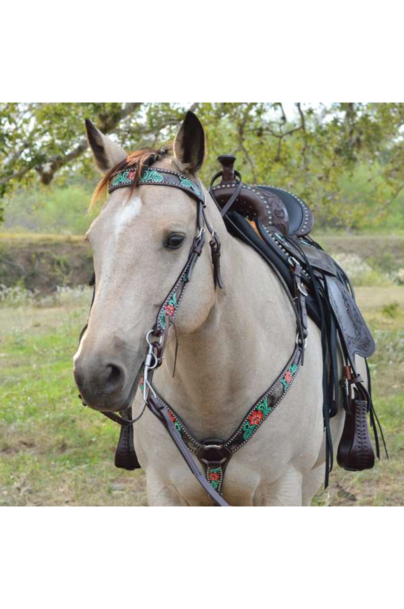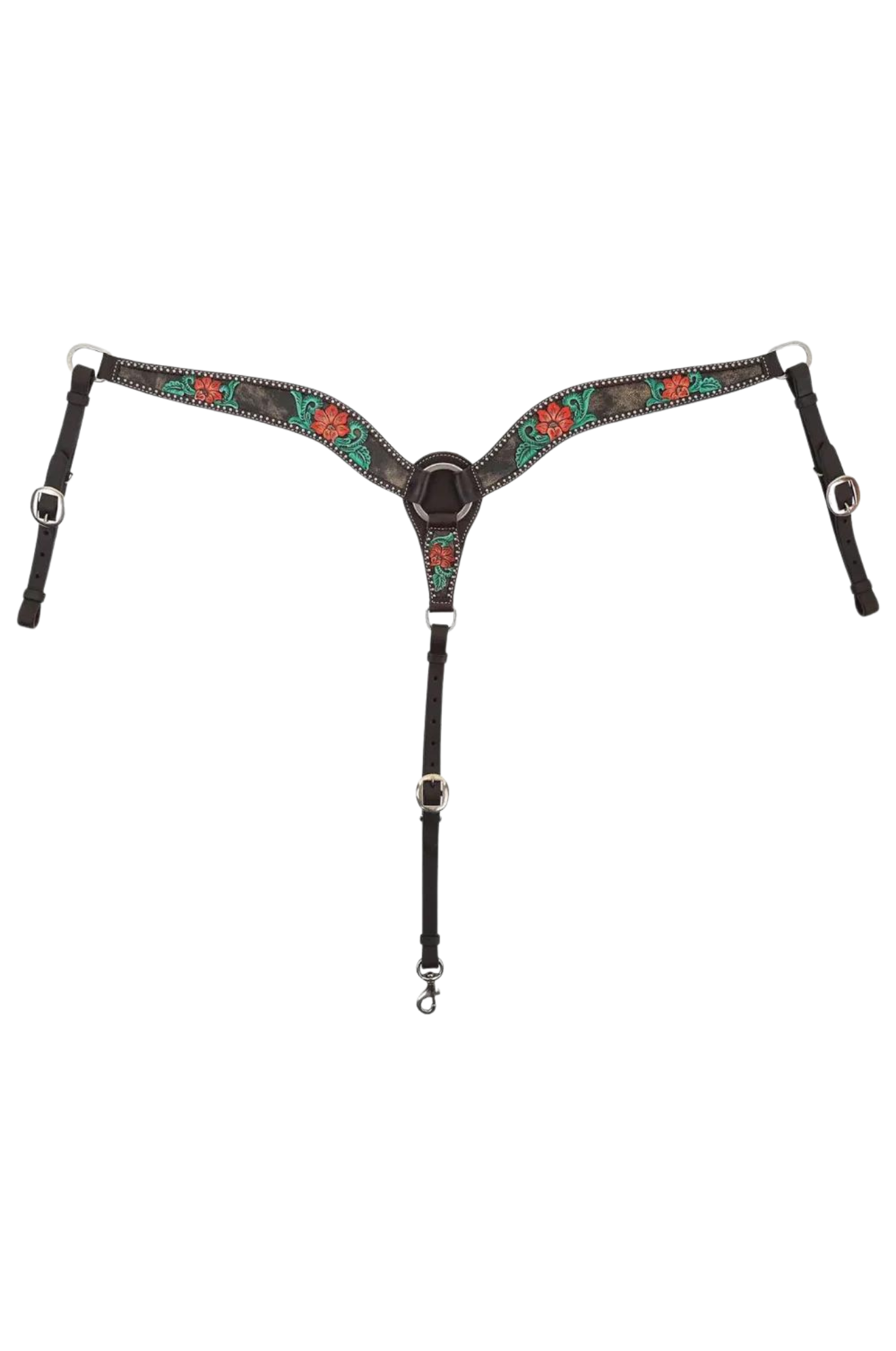 Circle Y Cactus Flower Breast Collar will complete your tack set in style. Quality chocolate brown leather features hand carved painted flower filigree overlay and vintage underlay. Stainless steel dots and hardware add up to sturdy construction and beautiful design. The Cactus Flower Filigree Breast Collar is horse sized and can be adjusted to fit most horses.