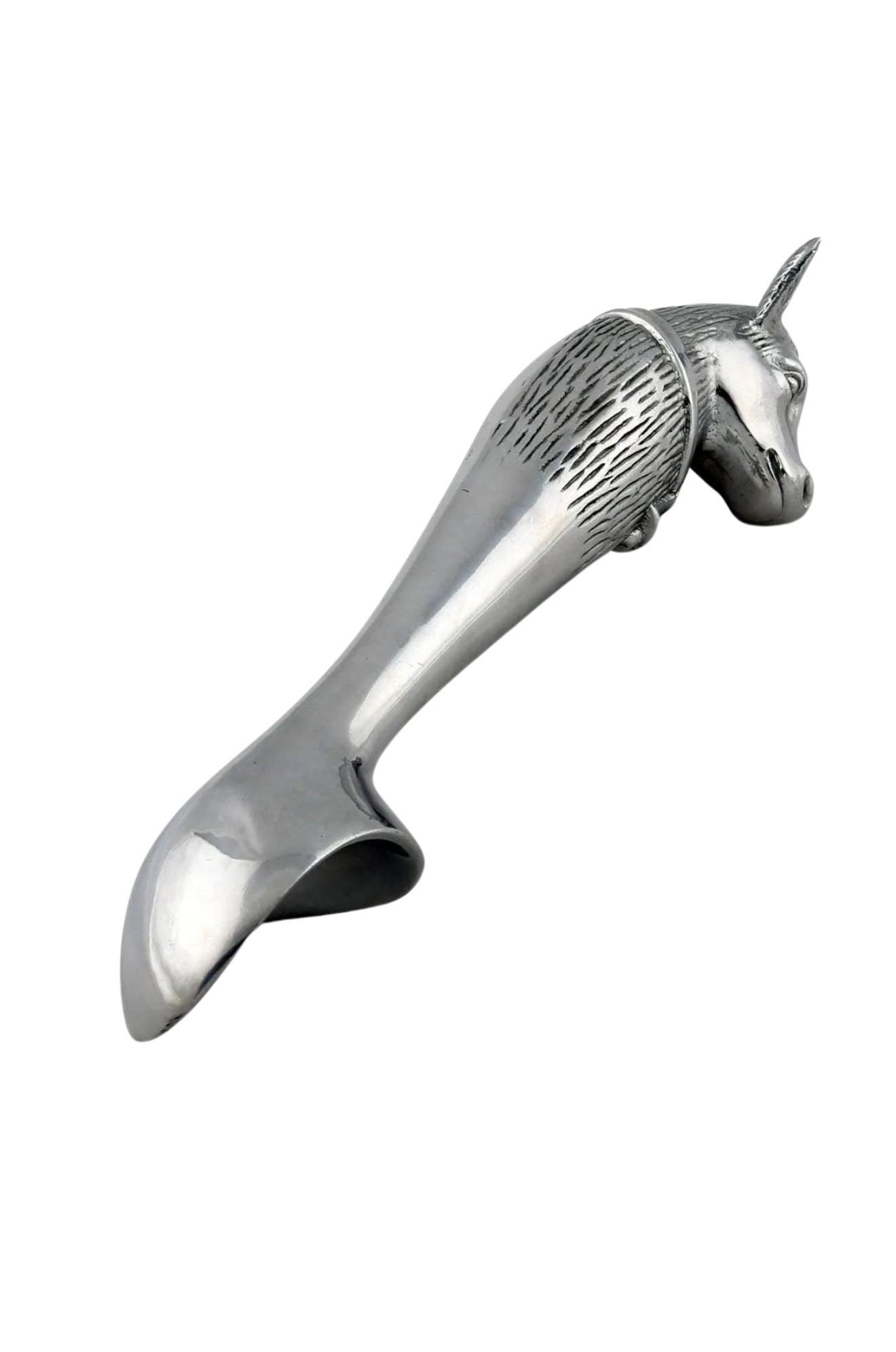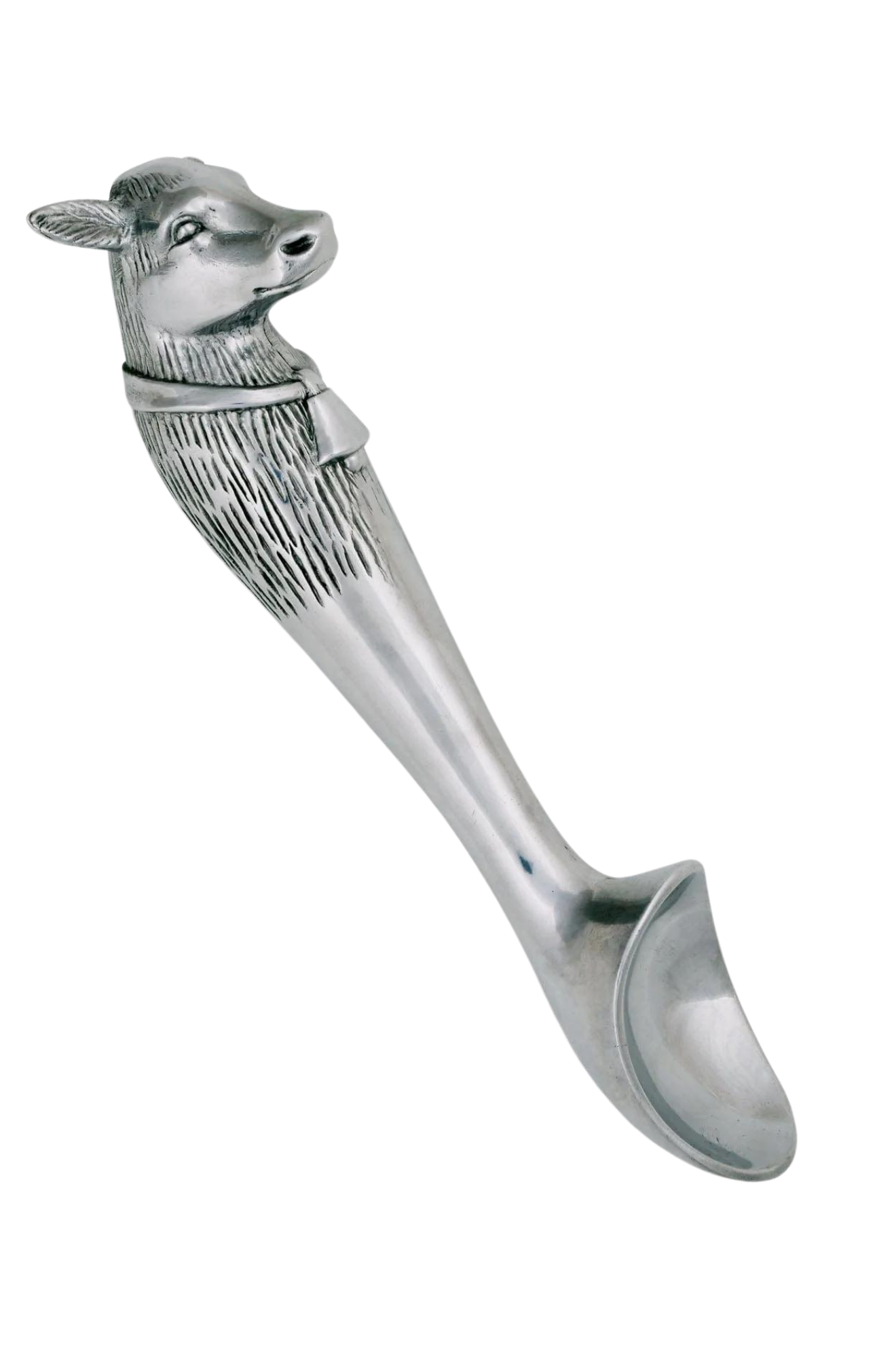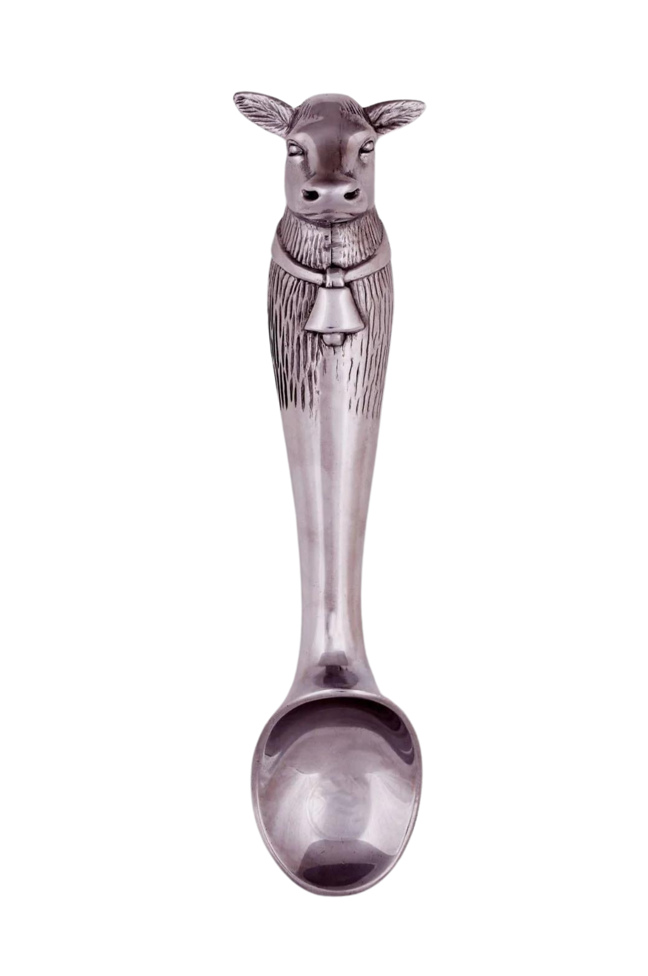 A cow head adorns the end of this piece as its big ears and muzzle jut out in realistic fashion. A distinguished bell hangs off a large band that stretches across the animal's torso, which is covered in intricate lines. The smooth bowl and neck of this handmade, aluminum scoop gleams against the textured designs on the handle.