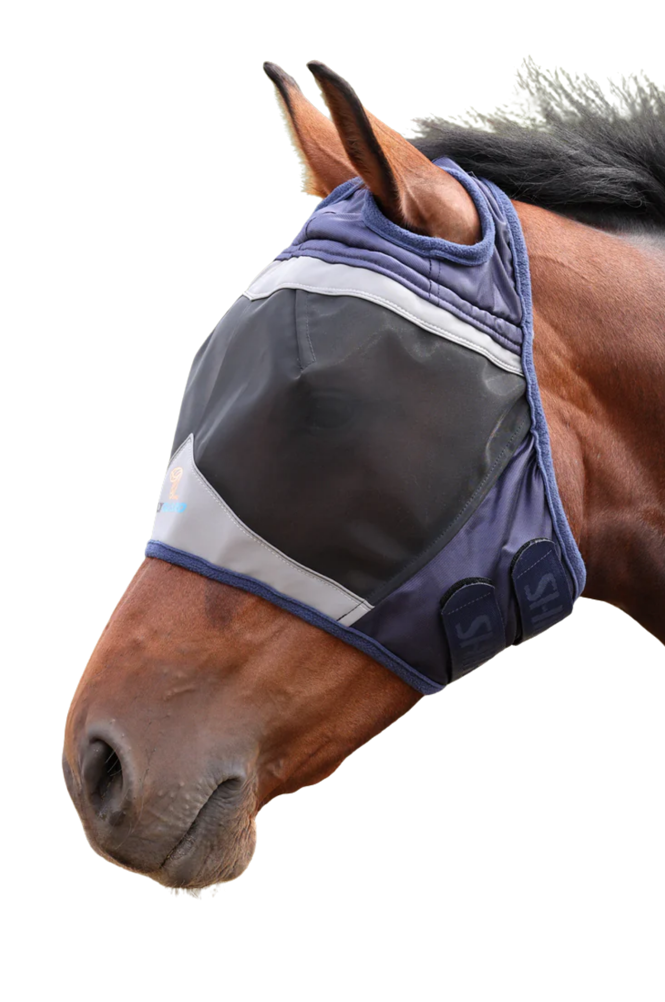 FlyGuard Pro fine mesh fly masks offer protection against the smallest of flies and midges. Fine mesh allows free flow of air and enables good visibility. The earless version is ideal for horses that like their ears free, the ear holes are comfortably lined in soft fleece to prevent discomfort. FEATURES: 3D eye visor. Secure fly proof mesh shield. Contour comfort fit. Anti-rub binding tech. Easy care fabrics. Quick fit secure straps. Durable for the field. Designed in the UK. Used by winners. 5 star fit. 70+% UV blocking, helping to diminish the risk of sunburn and sun bleaching. Minimum rating 60+% for eye and nose mesh. Effectiveness may diminish over time.